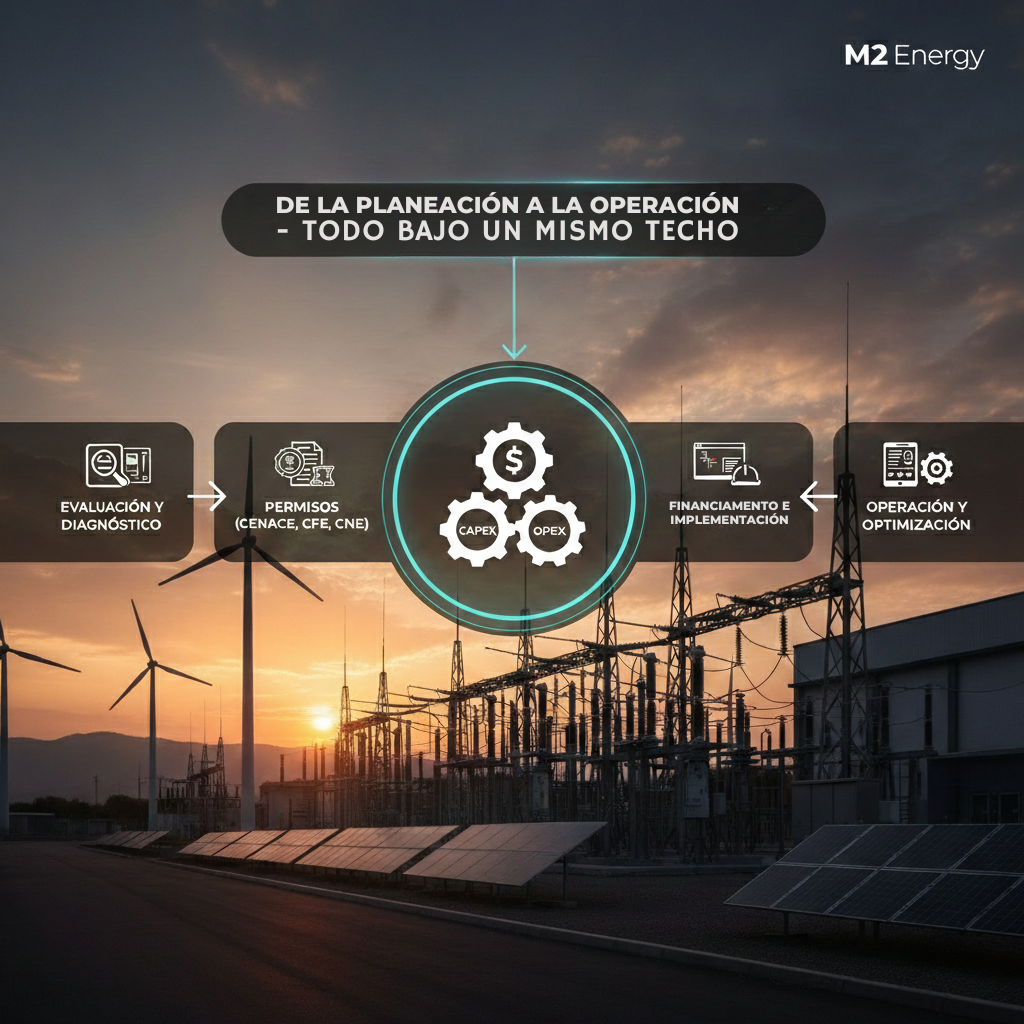 Significa que M2 Energy gestiona la cadena energética de extremo a extremo. No solo instalamos equipos; conectamos su operación desde el punto de acometida de la red nacional hasta los sistemas de generación en sitio y almacenamiento. Al ser un único punto de contacto para ingeniería, permisología ante CENACE/CFE y construcción, garantizamos que todos los sistemas hablen el mismo idioma y operen con máxima eficiencia.
