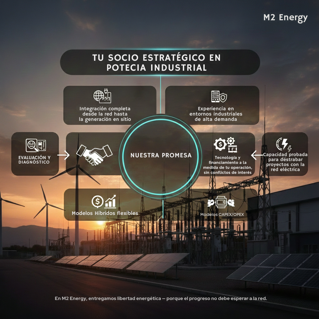 M2 Energy transforma las limitaciones de la red eléctrica en libertad operativa para la industria en México. Diseñamos y operamos soluciones de infraestructura integral que optimizan el costo y la calidad de su energía. Nuestra misión es eliminar los cuellos de botella energéticos, permitiendo que su empresa crezca con generación en sitio sin depender de las restricciones de la red.